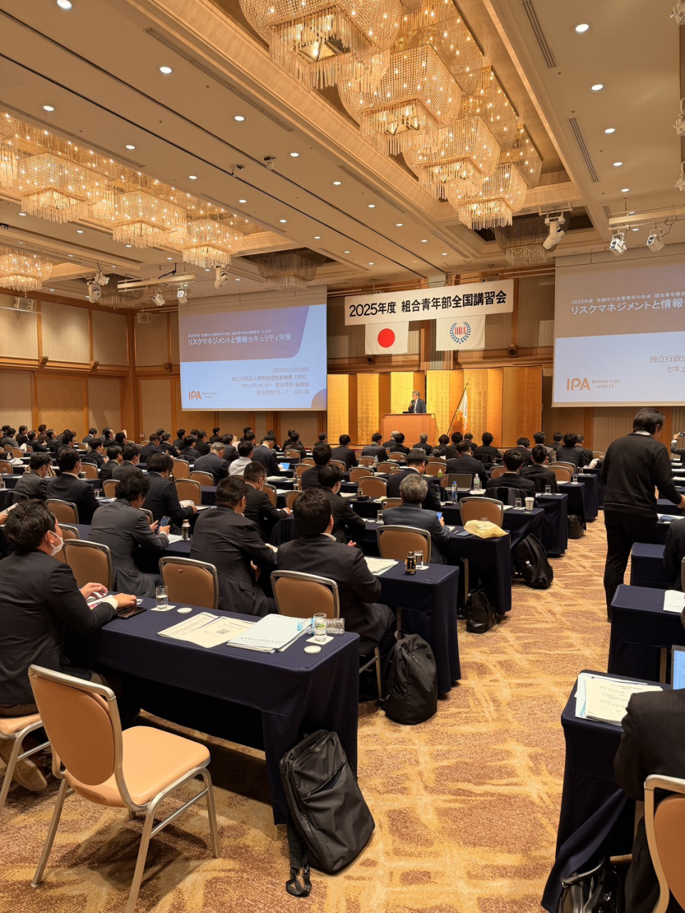 第2部の講演会では、独立行政法人情報処理推進機構(IPA)の白川浩氏より、リスクマネジメントおよび情報セキュリティー対策についてお話をいただき、ランサムウェアをはじめとしたサイバー攻撃の現状や、実際に中小企業で発生している被害事例が紹介されました。